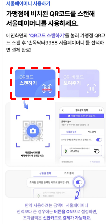 점포에 있는 서울페이 QR코드를 인식하여 결재하는 방법입니다.