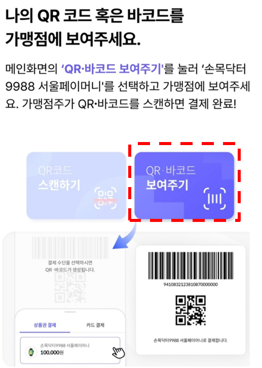 두 번째는 서울페이플러스 앱에서 생성된 QR 또는 바코드를 점포에 보여주시면 스캐너로 자동 결제가 가능합니다.