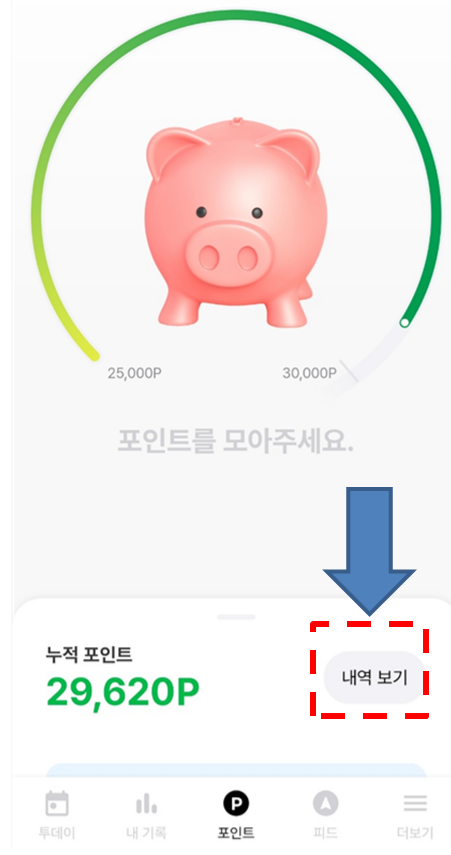 메인화면에서 화면 하단의 포인트 버튼을 클릭하여 포인트 화면으로 이동합니다 .
