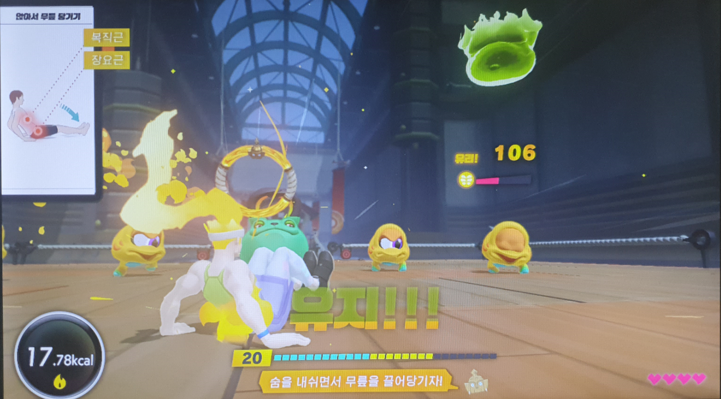 게임을 하게 되면 동작을 정확하게 하면 캐릭터의 근육 발생부위에 불이 타는 모습이 보이는데