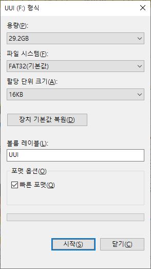 1. 부팅디스크로 사용할 USB를 포맷합니다. 빠른 포맷으로 선택 후 시작 버튼을 클릭합니다.