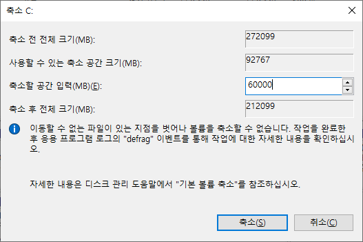 용도에 따라서 다를 수 있겠지만 전 해당 OS를 전문적인 서버용으로 사용할 생각은 없어서 기존 C드라이브에 할당된 60기가 정도를 할당하여 리눅스용 디스크로 사용하기로 하였습니다. (최소 요구사항은 만족)