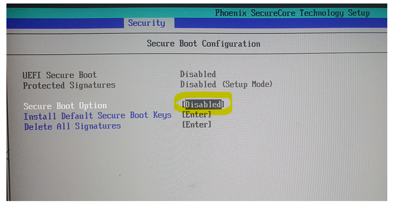 Secure Boot Configuration에서 Secure Boot Option을 Disabled값으로 변경해 줍니다.