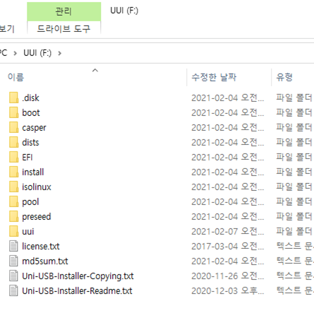 자 이 과정을 끝내면 아래와 같이 USB 드라이브에 설치 파일을 실행할 수 있는 형태로 USB 설치 디스크가 구성됩니다.