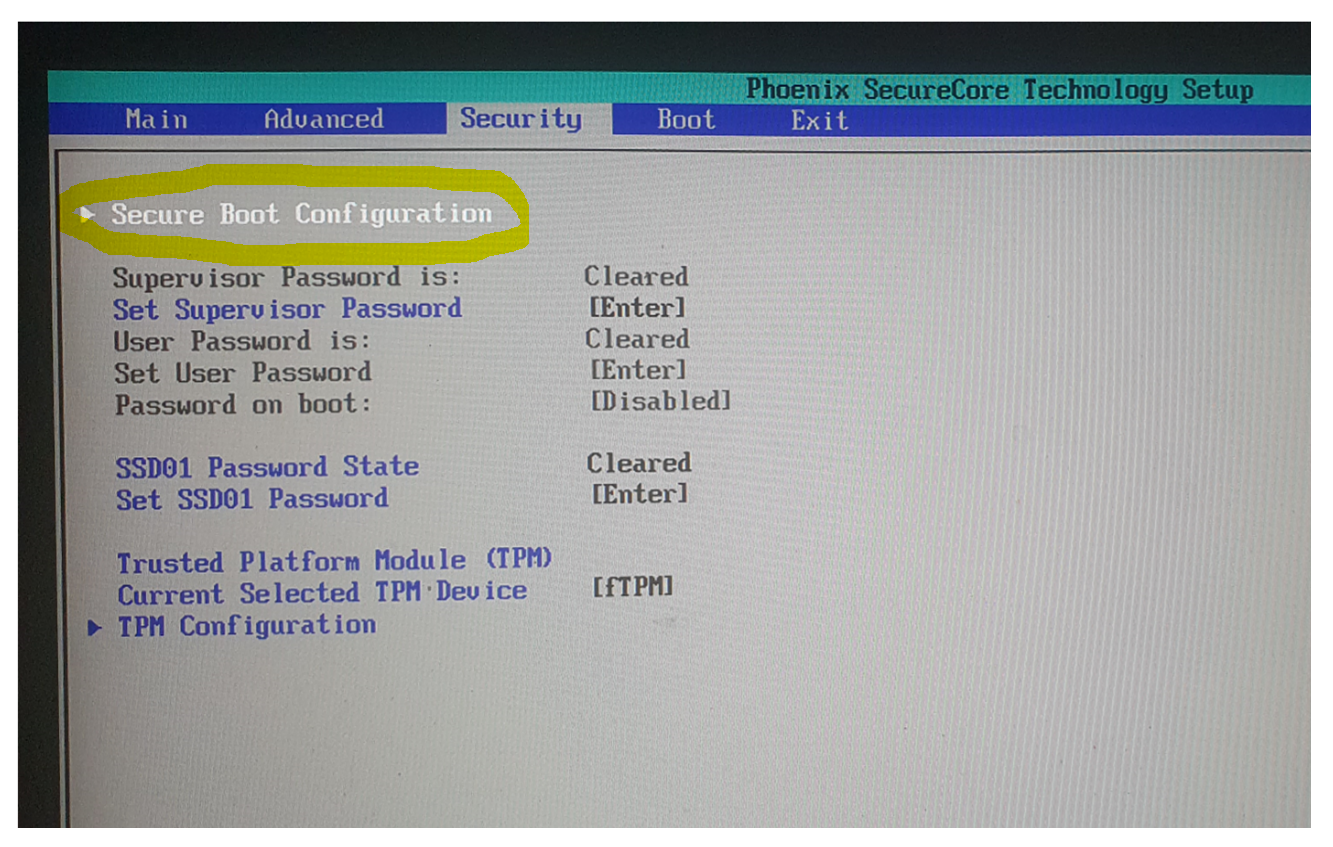자 윈도를 다시 시작합니다. BIOS 메뉴 진입을 위해 F2키를 누릅니다. 이 부분은 PC별로 틀린 수 있으므로 참고하셔야 할 것 같습니다. Security 메뉴를 선택 후 Secure Boot Configuration 메뉴를 클릭합니다.
