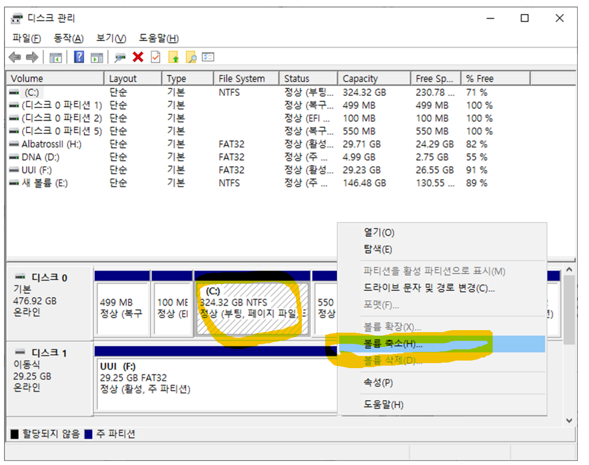 기존 C드라이브를 선택 후 마우스 오른쪽을 클릭하면 볼륨 축소라는 메뉴가 보입니다. 해당 메뉴를 클릭합니다.