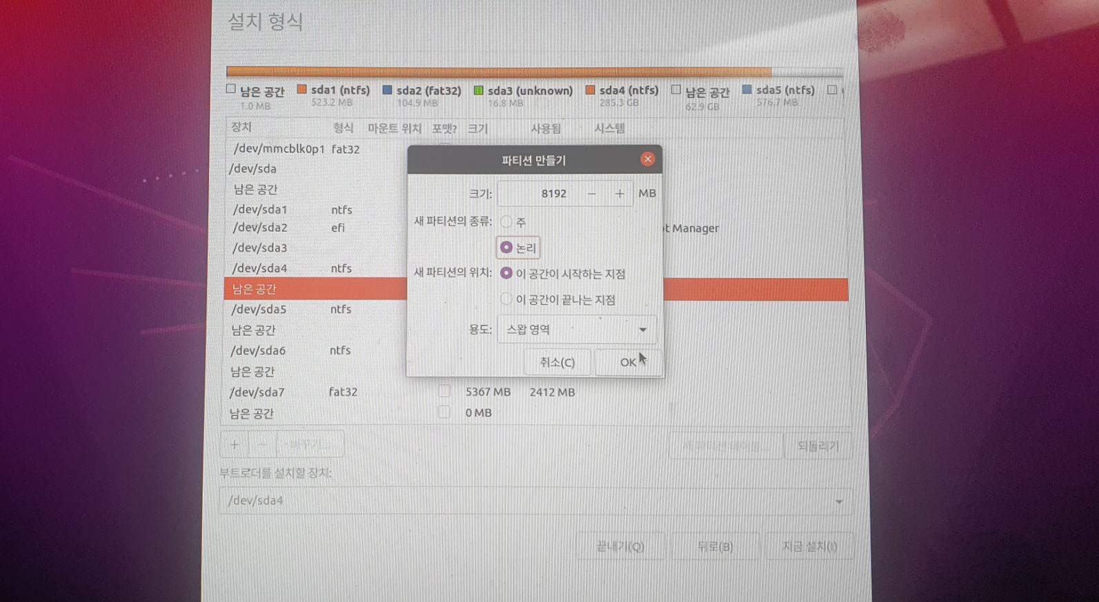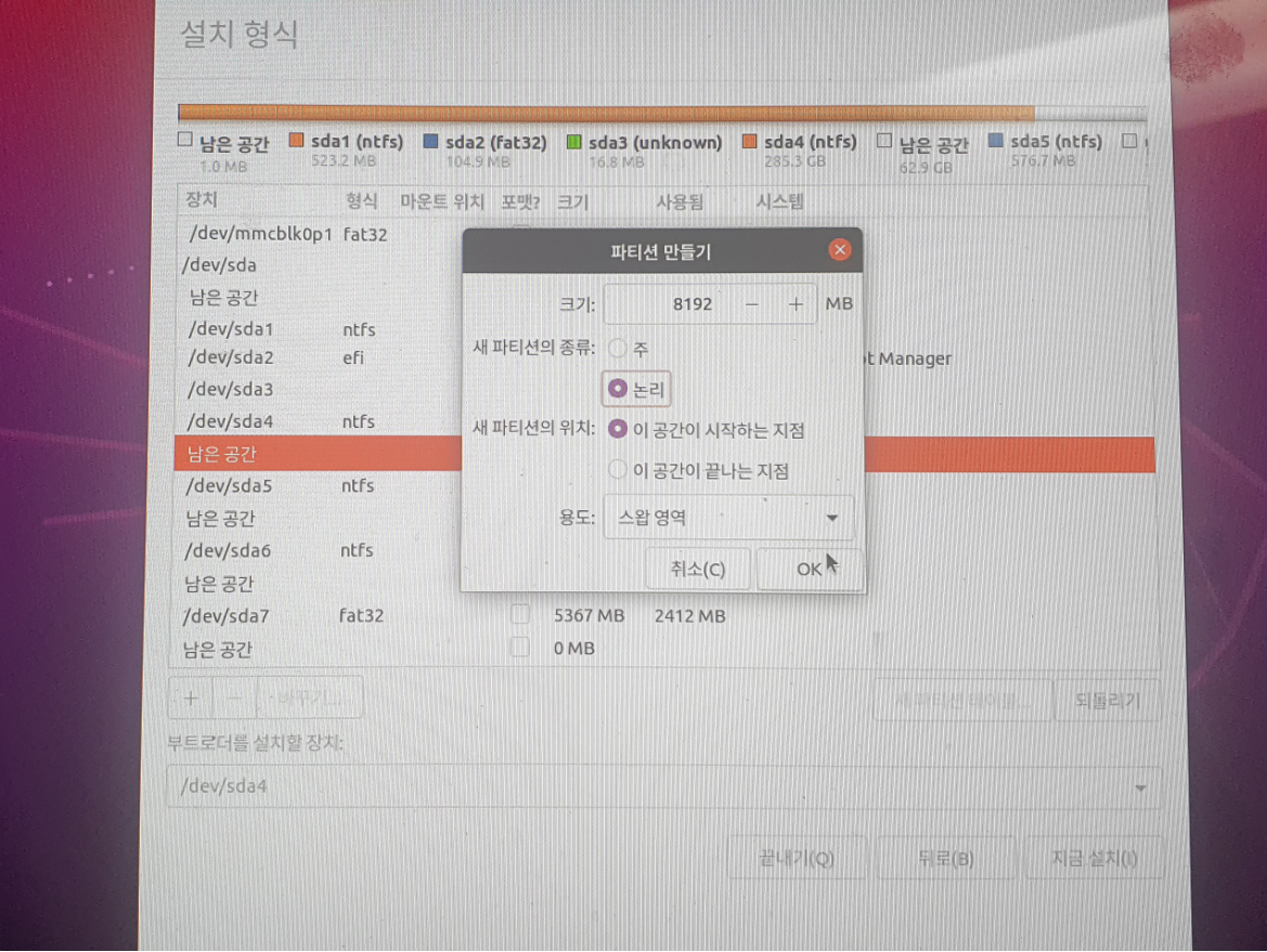 새 파티션의 종류는 '논리'로 선택하고, 새 파티션의 위치는 '이 공간이 시작하는 지점' 그리고 용도는 '스왑영억'을 선택합니다. 그리고 OK 버튼을 클릭합니다.