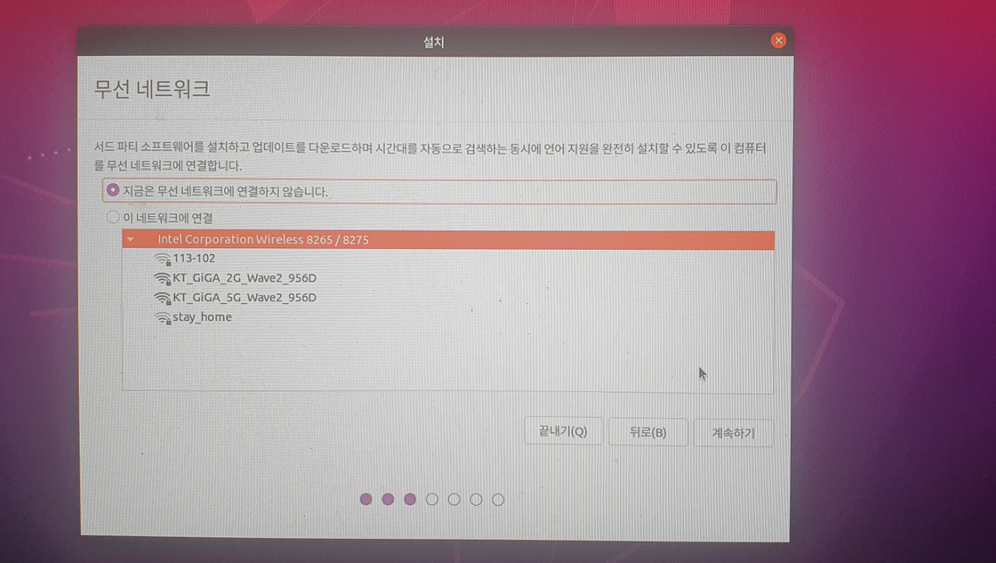 와이파이는 설치에 당장은 필요가 없으므로 선택하지 않았습니다. 리눅스 OS를 무선인터넷 환경에서 사용한다면 할 수 있는 것들이 좀 더 많아질 것 같다는 생각을 한번 해 봤습니다. 다시 설치에 집중하겠습니다.