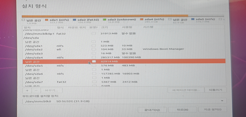 제가 리눅스 OS를 위해서 할당한 공간이 '남은 공간'으로 표시됨을 확인할 수 있습니다.