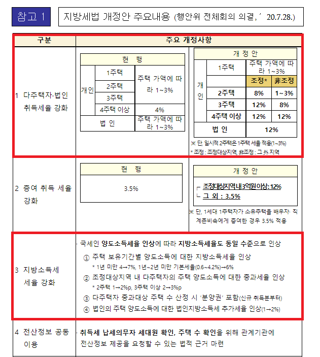 20년 7월 국토교통부 보도자료에서는 다주택자 및 법인의 취득세율이 강화가 된 것이 특징입니다. 특히 2주택 보유자의 취득세 8%는 굉장히 부담되는 수치가 아닐 수가 없네요. 상가 및 토지 매매시 발생되는 4.6%취득세가 상당히 높다고 생각했었는데 강화된 취득세에 비하여 상대적으로 낮다는 것을 알 수 있습니다.