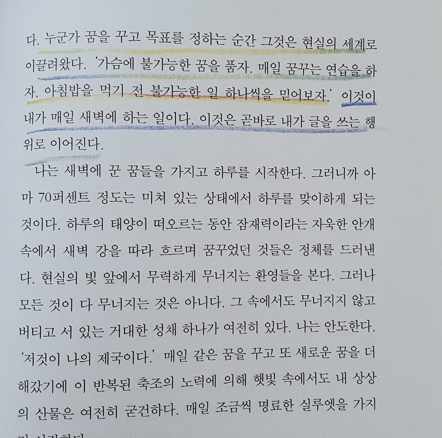 가슴에 불가능한 꿈을 품자. 매일 꿈꾸는 연습을 하자. 아침 밥을 먹기 전 불가능한 일 하나씩을 믿어보자.