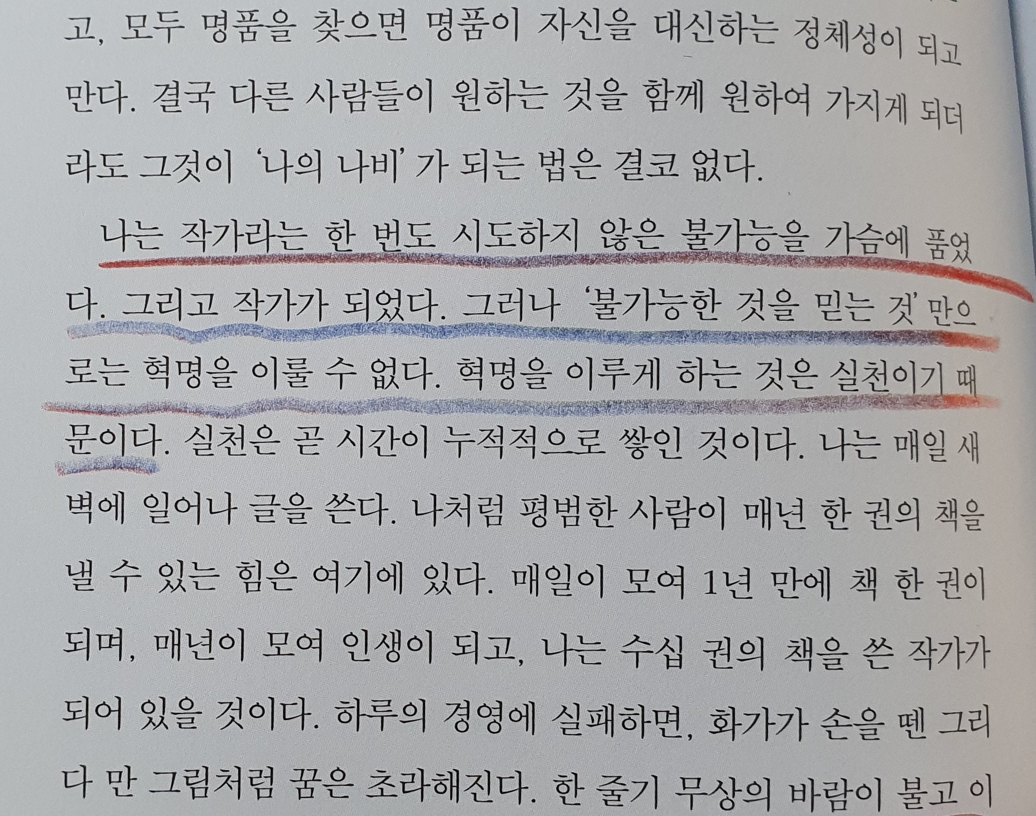 주말에 한번 끝까지 읽어 보겠다고 작심하고 금세 읽을 수 있었다. 위인의 이야기와 작가의 메시지를 읽고 생각하며 나 자신에게도 질문을 계속 던지게 되었다.