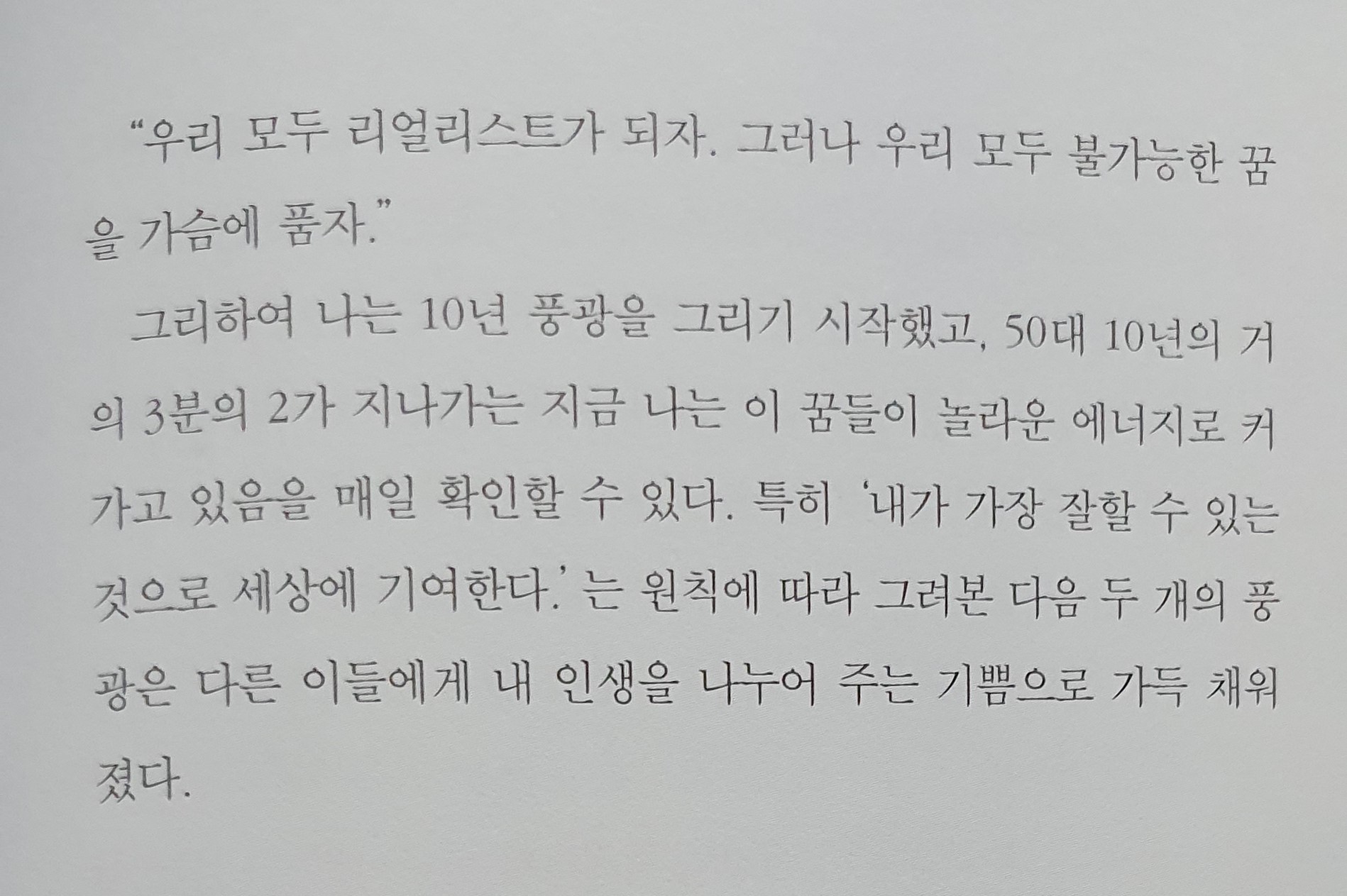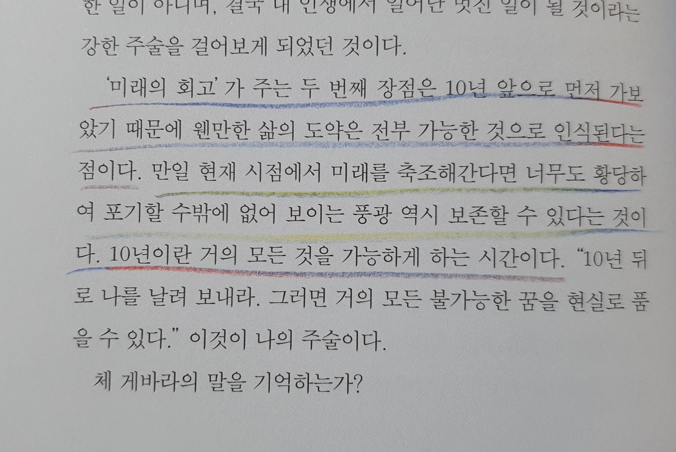 작가님은 '미래의 회고'를 통해 40대에 미래 시점의 50대에 10년이 훌륭했다 라고 말할 수 있는 10개의 아름다운 장면을 그려보았다.