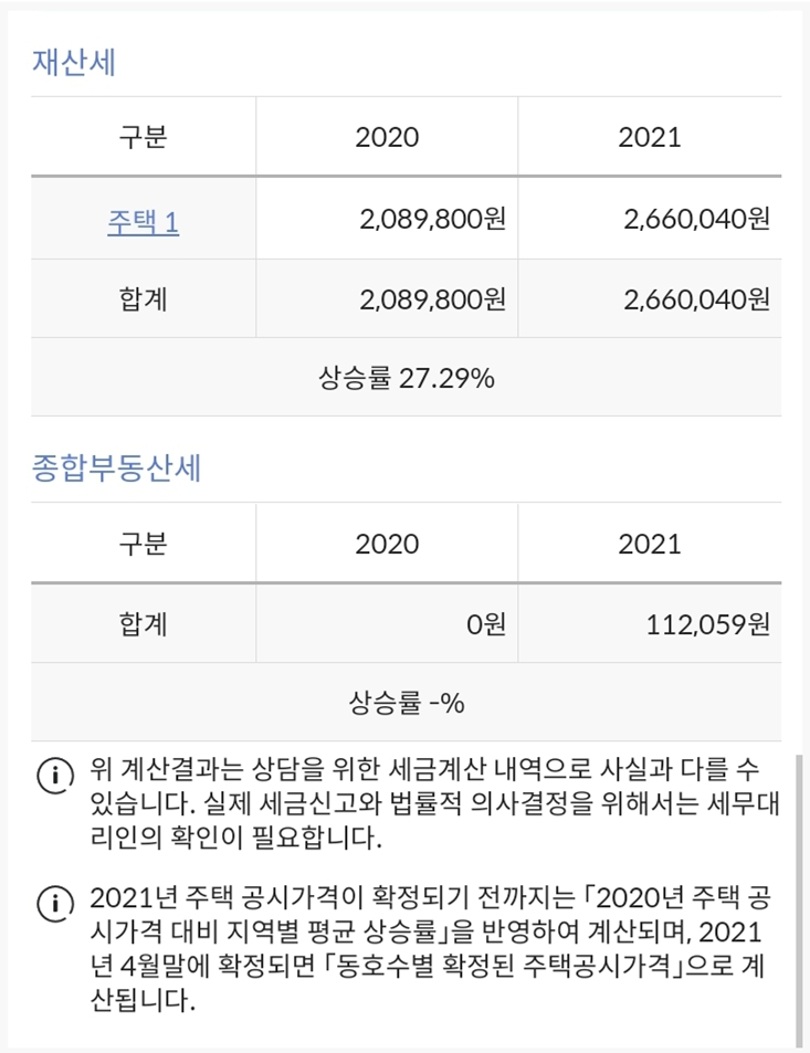 ■ 최종 결과를 확인합니다. 재산세와 종합부동산세 결과를 확인할 수 있습니다.