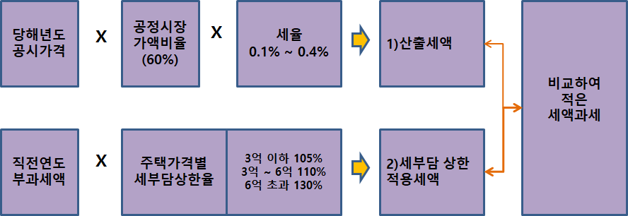 산출된 재산세액이 전년도 재산세액 대비 일정 비율을 초과하는 경우 초과하는 금액은 없는 것으로 하도록 세부담상한을 적용합니다. 공시가 상승에 따른 재산세 산출세액이 급증하는 부담을 완화하기 위한 제도입니다.