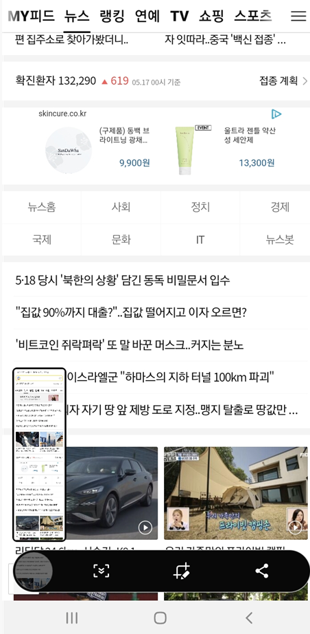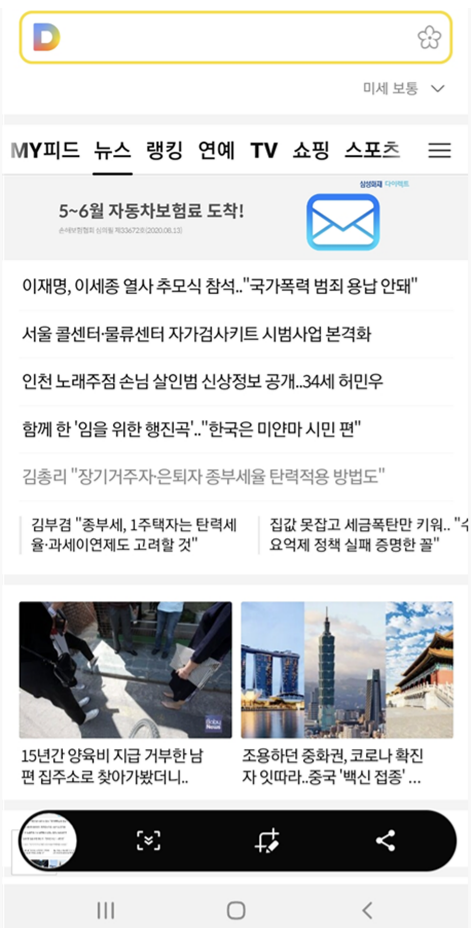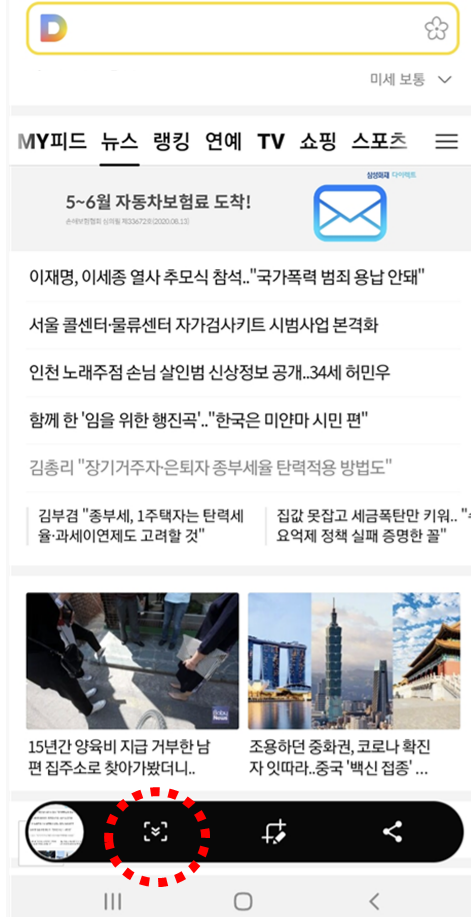1) 캡처를 원하는 스마트폰 화면에서 캡처 기능을 활성화합니다. 전 다음 포탈의 메인화면을 샘플로 진행했습니다.