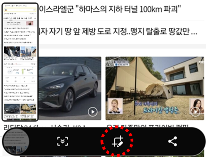 아마도 캡처 버튼을 누르시거나 손바닥으로 왼쪽으로 밀어서 하실 수 있을 겁니다. 하게 되시면 아래와 같은 화면이 나옵니다.