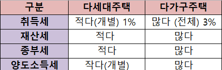 다세대와 다가구의 차이점에서 특히 세율구간에 따라 내야 되는 세금이 달라지게 됩니다. 다세대 주택은 개별 세대별로 세금이 나오기 때문에 과세 표준상에 세율이 낮게 책정되어 세대수만큼 곱해서 산출되나 다가구 주택은 한 주택 이기 때문에 세율이 굉장히 높게 책정됩니다.