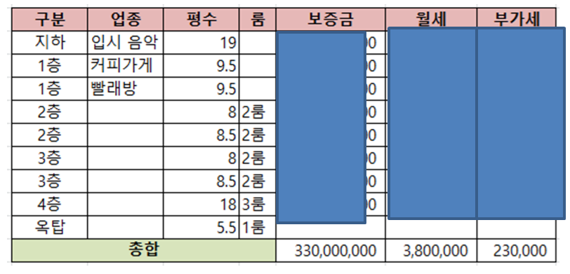 최종 확인된 것은 월세 총 403만 원, 공실은 옥탑방