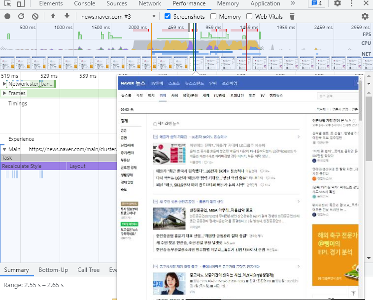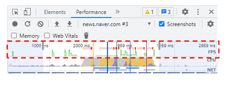 사용자가 빠른 부드럽고 자연스러운 웹페이지라는 것을 체감하기 위해서는 화면의 FPS(초당 프레임수)가 높은 것이 필수입니다. 아래 화면에서 FPS 라인의 빨간색 선과 초록색 그래프가 FPS를 의미합니다. 빨간색 바가 많이 보인다면 FPS가 너무 낮아서 사용자가 불편을 느낄 수 있습니다. 녹색 막대가 위에 분포되어 있을수록 FPS가 잘 분포되어 있는 겁니다.