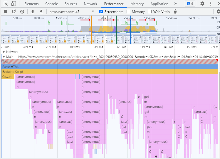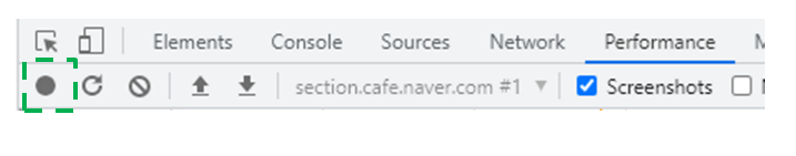 성능 분석은 웹페이지 실행되고 있을 때 특정 구간을 녹화한 후 그 구간을 분석하는 방식으로 이루어집니다.