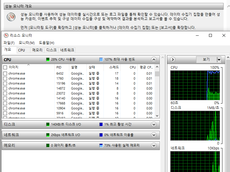 성능 저하 체감 시 상황을 모니터링해보니 크롬 브라우저의 메모리와 CPU 사용률이 갑자기 높아지면서 버벅거림이 나타나기 시작했습니다.