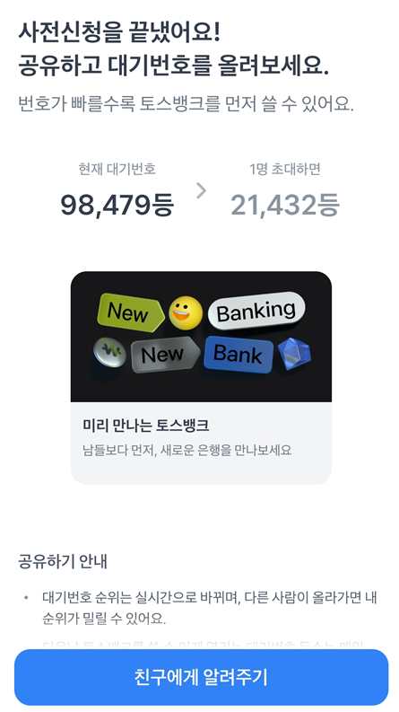 이렇게 사전 신청을 하면서 토스 뱅크 사용 대기번호를 줄이기 위해서 저도 카톡으로 여러 명에게 토스 뱅크 사전 신청을 홍보하게 되더라고요 제 소개를 받은 사람들이 또 홍보를 또 다음 홍보 또 홍보