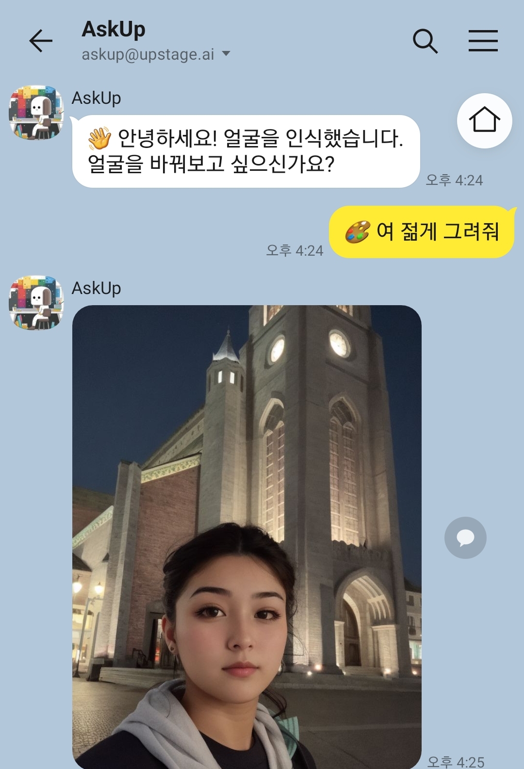아숙업 대화창에 제 사진을 업로드 하면 AI가 저 얼굴을 젊게 또는 멋있게