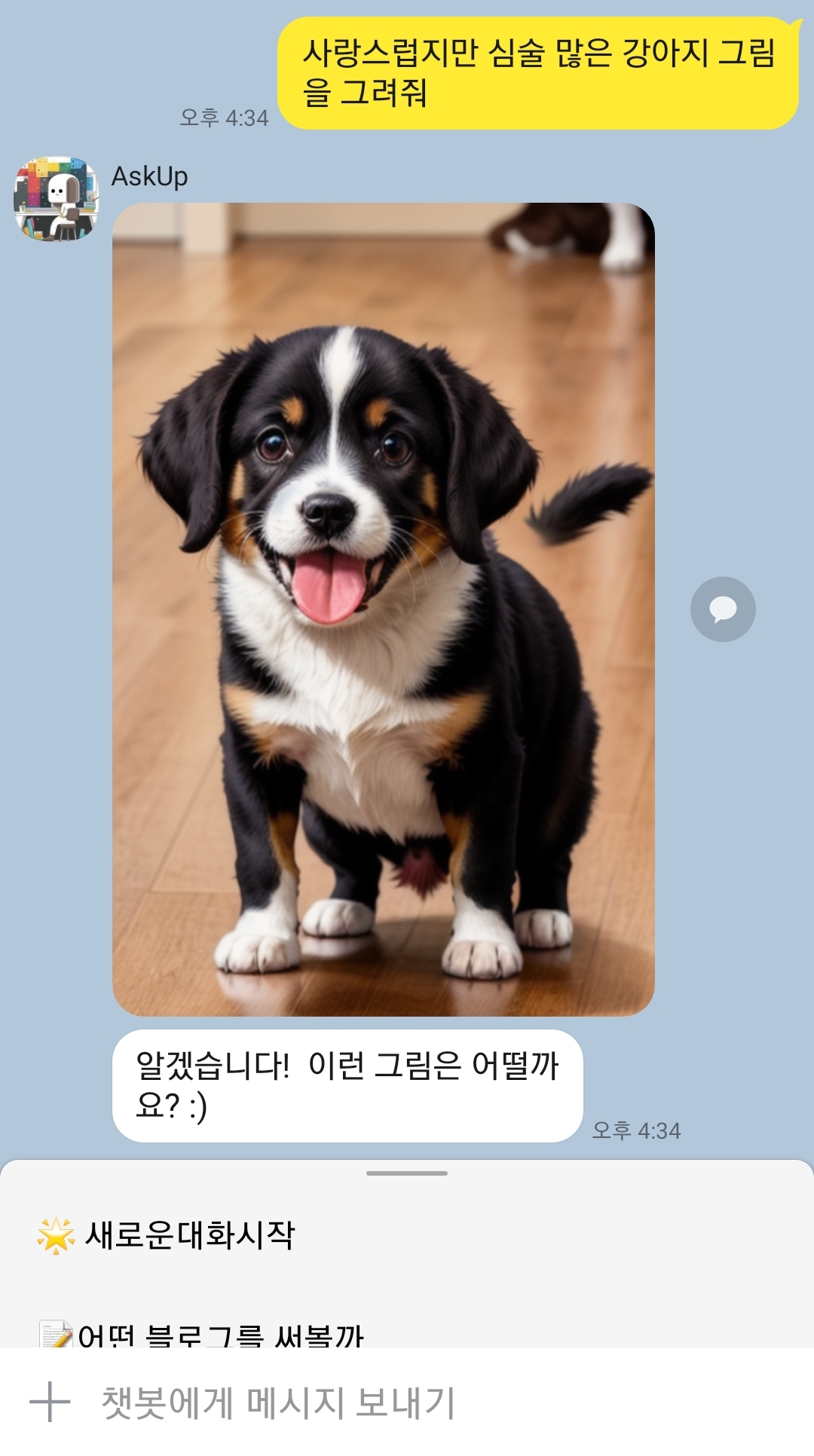 카톡에서ChatGPT를 사용할 수 있는 아숙업에서 그림 그려주는 인공지능(AI) 기능이 나왔습니다.