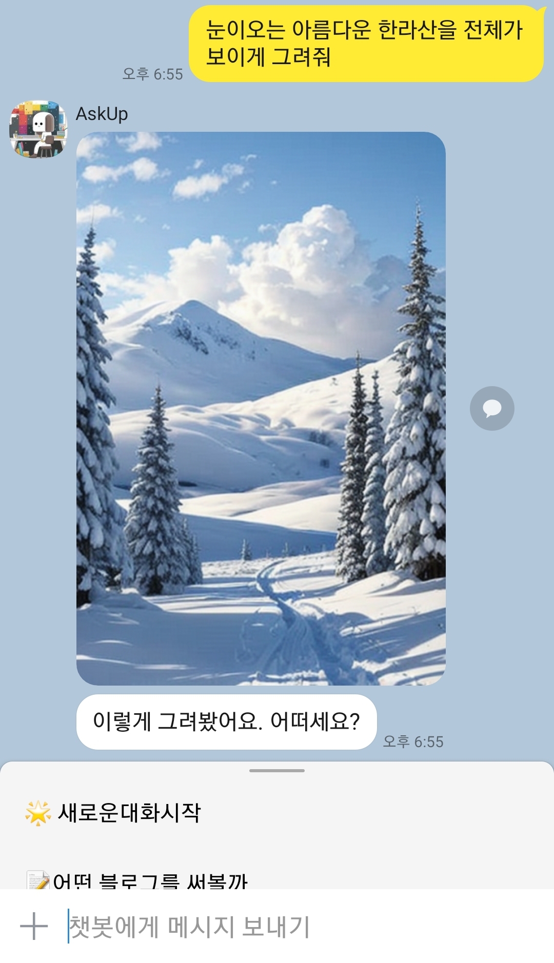 이번에는 한라산 풍경을 그려달라고도 해보았습니다.