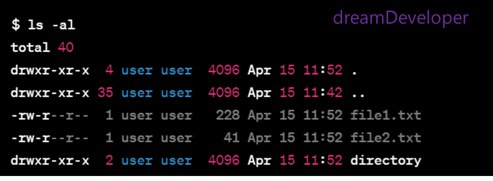 예를들면 ls -al 명령어는 현재 작업 디렉토리의 모든 파일 및 디렉토리를 상세한 정보와 함께 표시하는 명령어입니다.