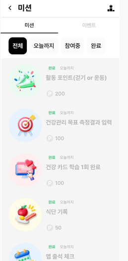 포인트들은 아래 미션 메뉴에서 정해진 미션들을 수행할 때마다 자동으로 적립이 됩니다.